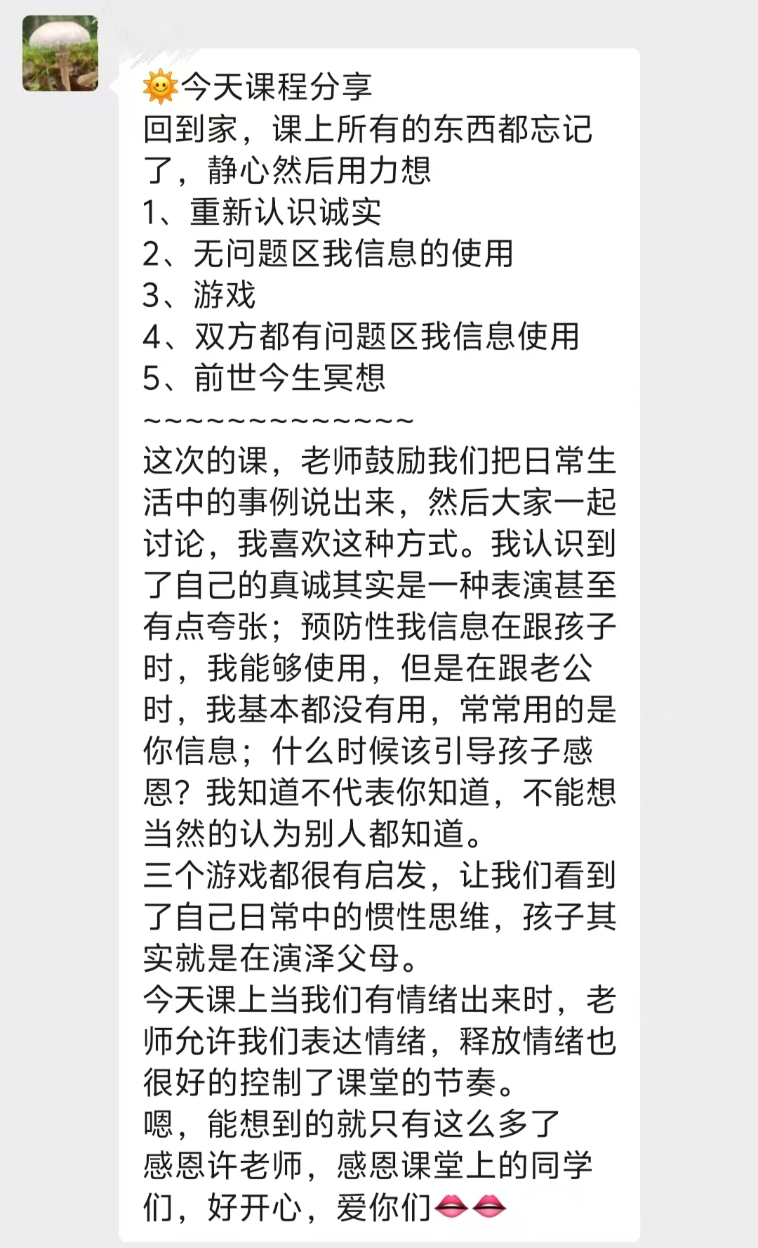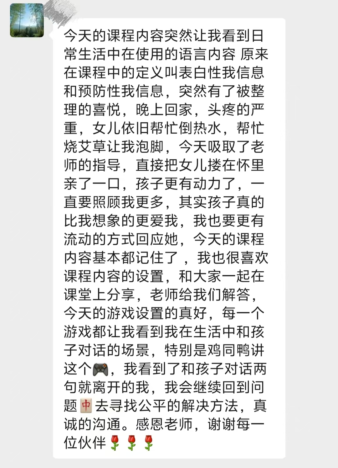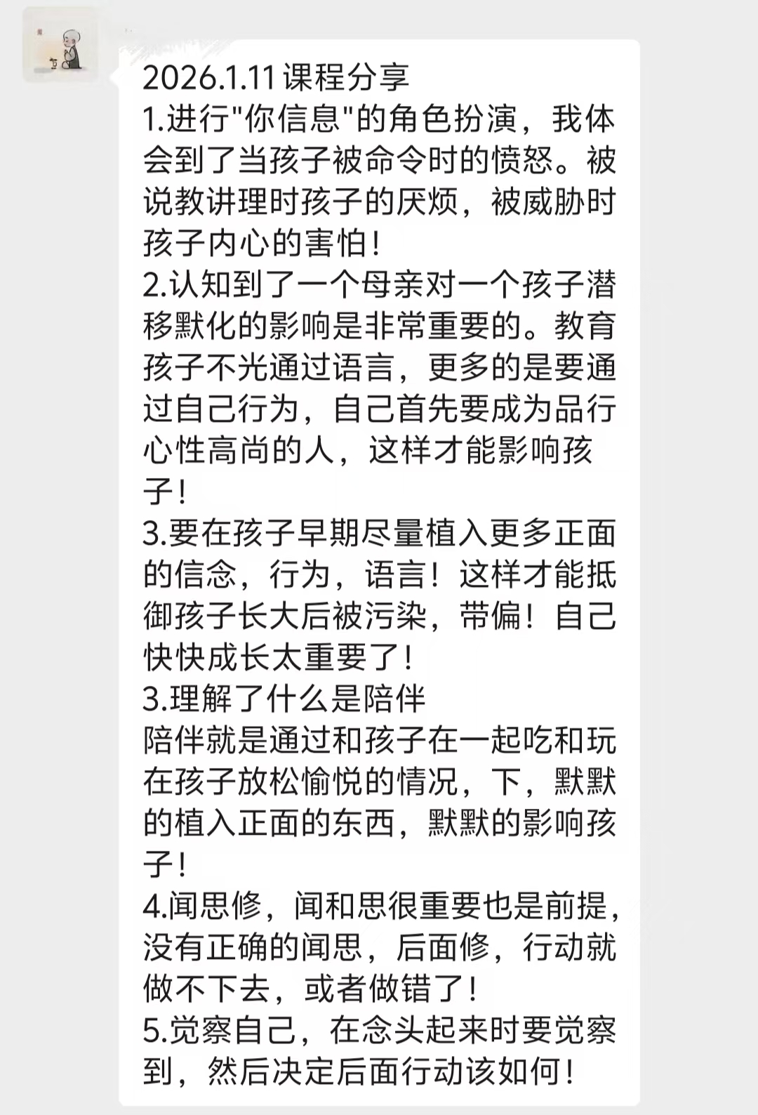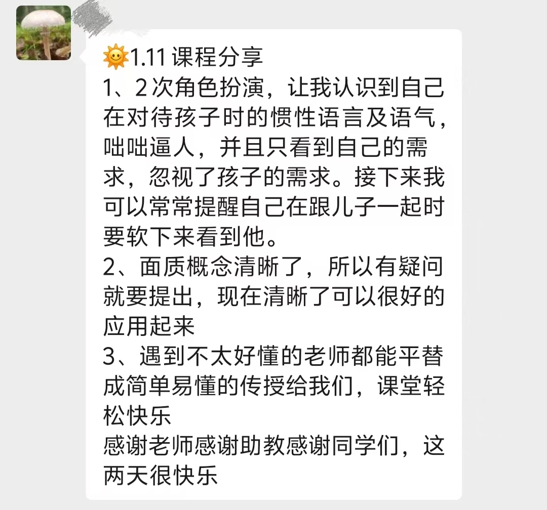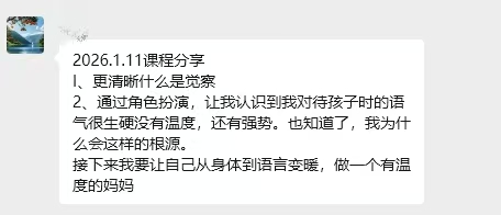 这次的学习,是一场从‘自动驾驶’到‘主动觉察’的练习。家长们学习的,不是新的控制术,而是一种既尊重孩子,也尊重自己的沟通‘语法’。当语法正确,爱意才能顺畅流通,合作才有可能发生。”